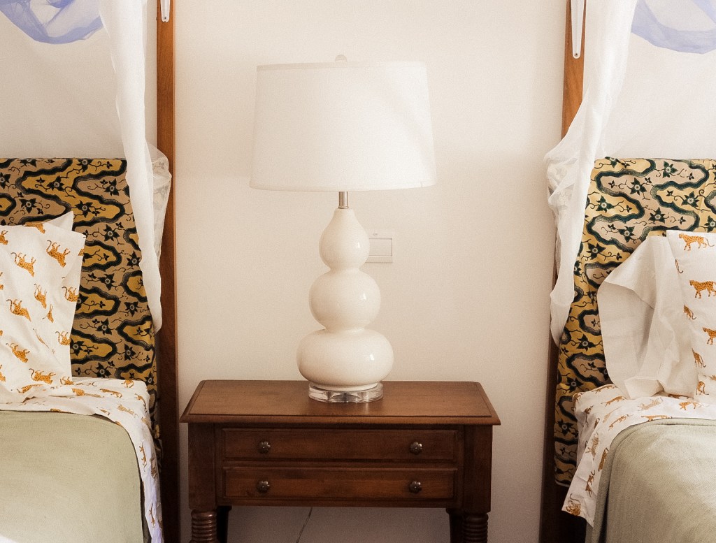 Some things about this room I couldn’t change. Some of the dark furniture had to stay, unfortunately. Luckily, for such a vibrant room, the lamp lent itself towards that vibe, and sits perfectly in-between the two beds. A sight that makes this room vibrant, but also serene.