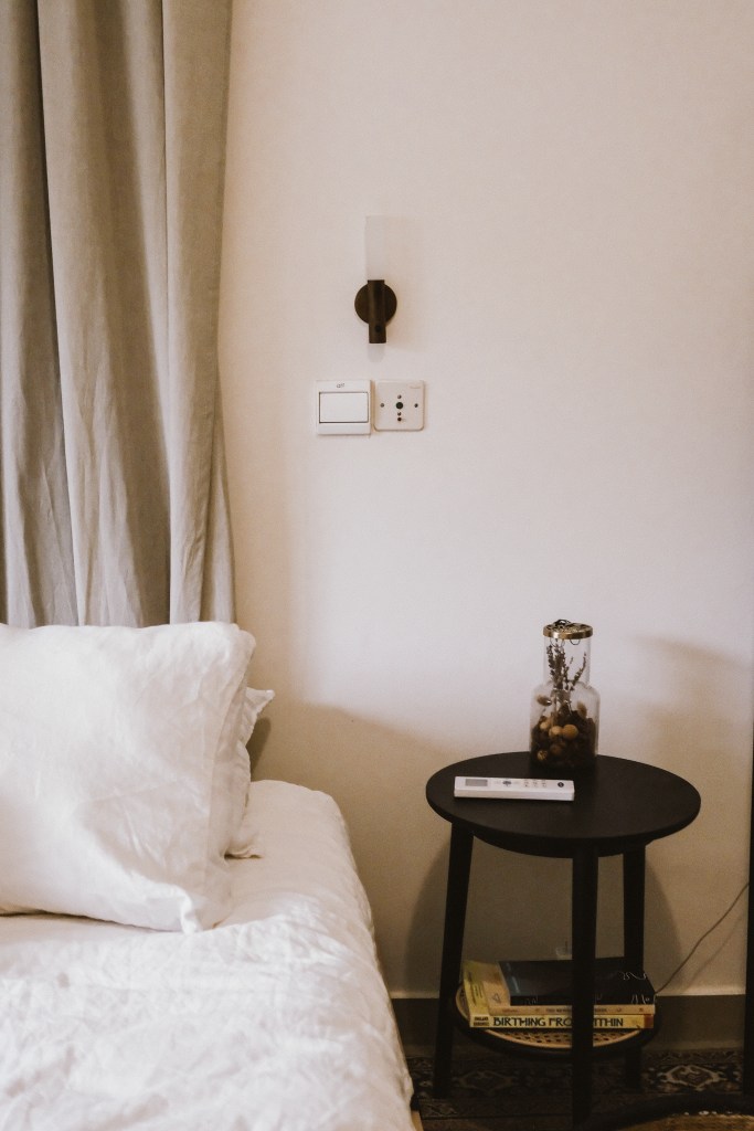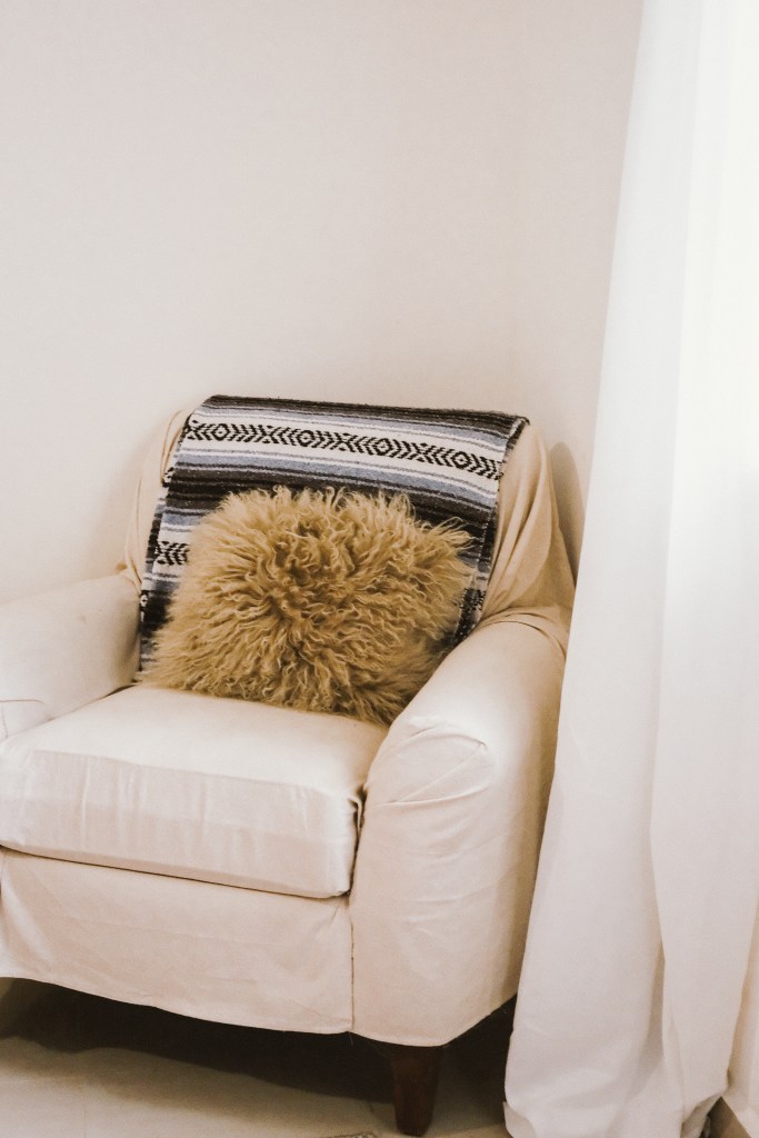 Two of my proudest realizations in this room was, to switch the orientation of the bed from which it was initially set up, as the original way had us facing a window that faces a wall. And to cover the chair in the bedroom for obvious reasons. You’ll see below.